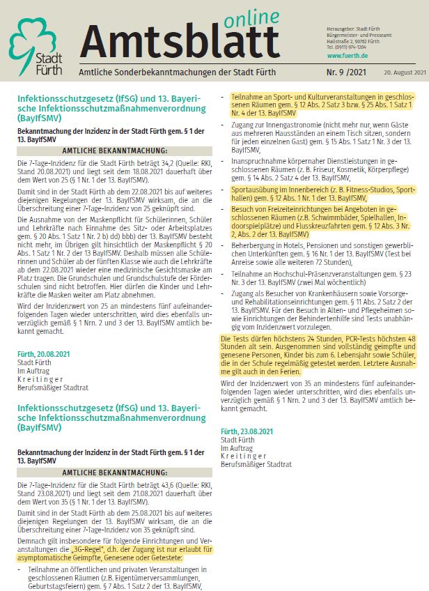 Laut unten stehender Sonderbekanntmachung der Stadt Fürth vom 20. August 2021 (geändert am 23. August 2021) ist eine Teilnahme am Sportbetrieb nur unter Einhaltung der 3G-Regel, möglich.