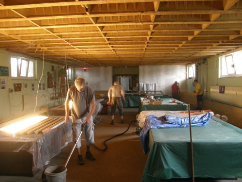 Da jetzt die Saison zu Ende ist, hat sich die Billardabteilung die Renovierung des Saales vorgenommen. Die neuen Deckenverstrebungen sind bereits montiert und die Lampen wieder an ihrem Platz. Jetzt müssen nur noch die Elektriker für die ordnungsmäßige Verlegung der Leitungen sorgen; dann kann auch wieder an den Tischen gespielt werden.