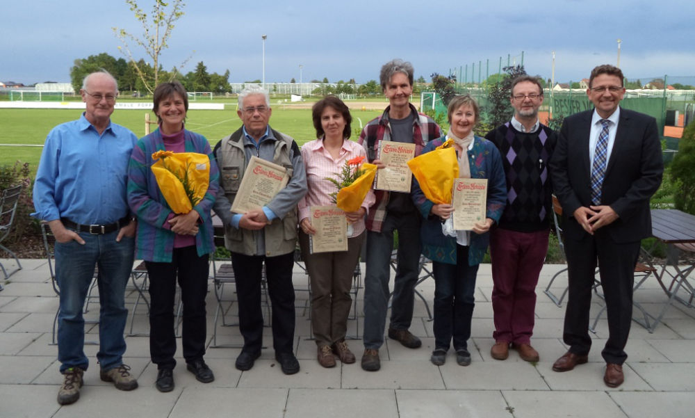 Heidl Rainer und Nieberle Dagmar von der Volleyballabteilung für 40-jährige Mitgliedschaft sowie Edmund Kern, Fürst Angela, Weiss Hjalmar und Donth Herbert, alle von Aikido, für 25-jährige Mitgliedschaft. In Abwesendheit wurden geehrt: Rudi Schuster (Fußballabteilung) für 40-jährige Mitgliedschaft und für jeweils 25-jährige Mitgliedschaft Adrian Christine, Fürst Gerhard, Heuser Marc, Hyalla Anette, Speck Siegfried und Ruzicka Vojtech.