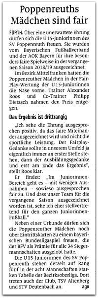 Poppenreuths Mädchen sind fair…Von admin / 13. November 2019 Unerwartete Ehrung für unsere U15-Juniorinnen. Mehr im Zeitungsartikel in der NZ vom 13.11.2019